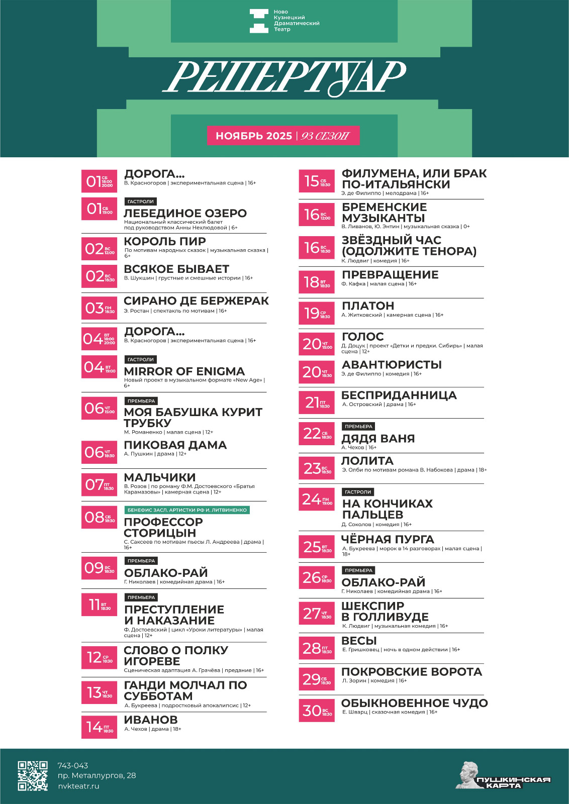 Афиша Новокузнецкого драматического театра на ноябрь 2025.