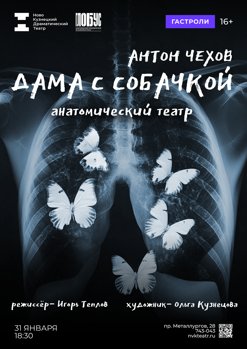 Антон Чехов«ДАМА С СОБАЧКОЙ» Анатомический театр Бывает так. Живет себе мужчина средних лет, и всё у него хорошо. Богатый дом, приличная семья, светские развлечения и легкие адюльтеры. А потом он встречает женщину. Даму с собачкой. И ведь ничего особенного в ней нет. Но вдруг привычный мир разваливается на куски. На человека сваливается непонятная болезнь. Любовь. Сумасшествие. Амок. «Дрыдыриц», который невозможно излечить. Врач по профессии, Антон Павлович Чехов знал, какой диагноз ставить себе и своим героям. На сцене – интригующее и ироничное переосмысление хрестоматийного рассказа. Анатомический театр, где так пристально исследуются человеческие души, эмоции, воспоминания. Правда, за всеми этими, казалось бы, парадоксальными решениями то и дело да мелькнет чеховское пенсне. 16+, есть Пушкинская карта Участие спектакля в фестивалях 2025 г. – г. Новосибирск. XVI Международный Рождественский фестиваль искусств. Действующие лица и исполнители: