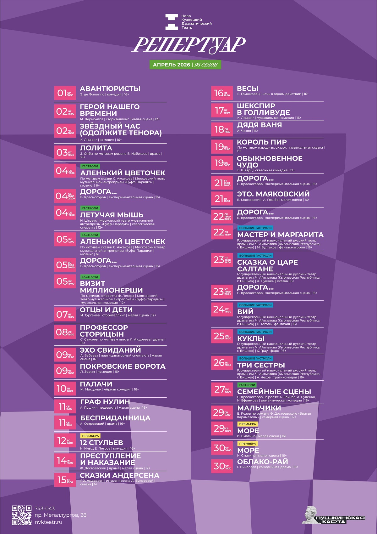 Афиша Новокузнецкого драматического театра на апрель 2026.