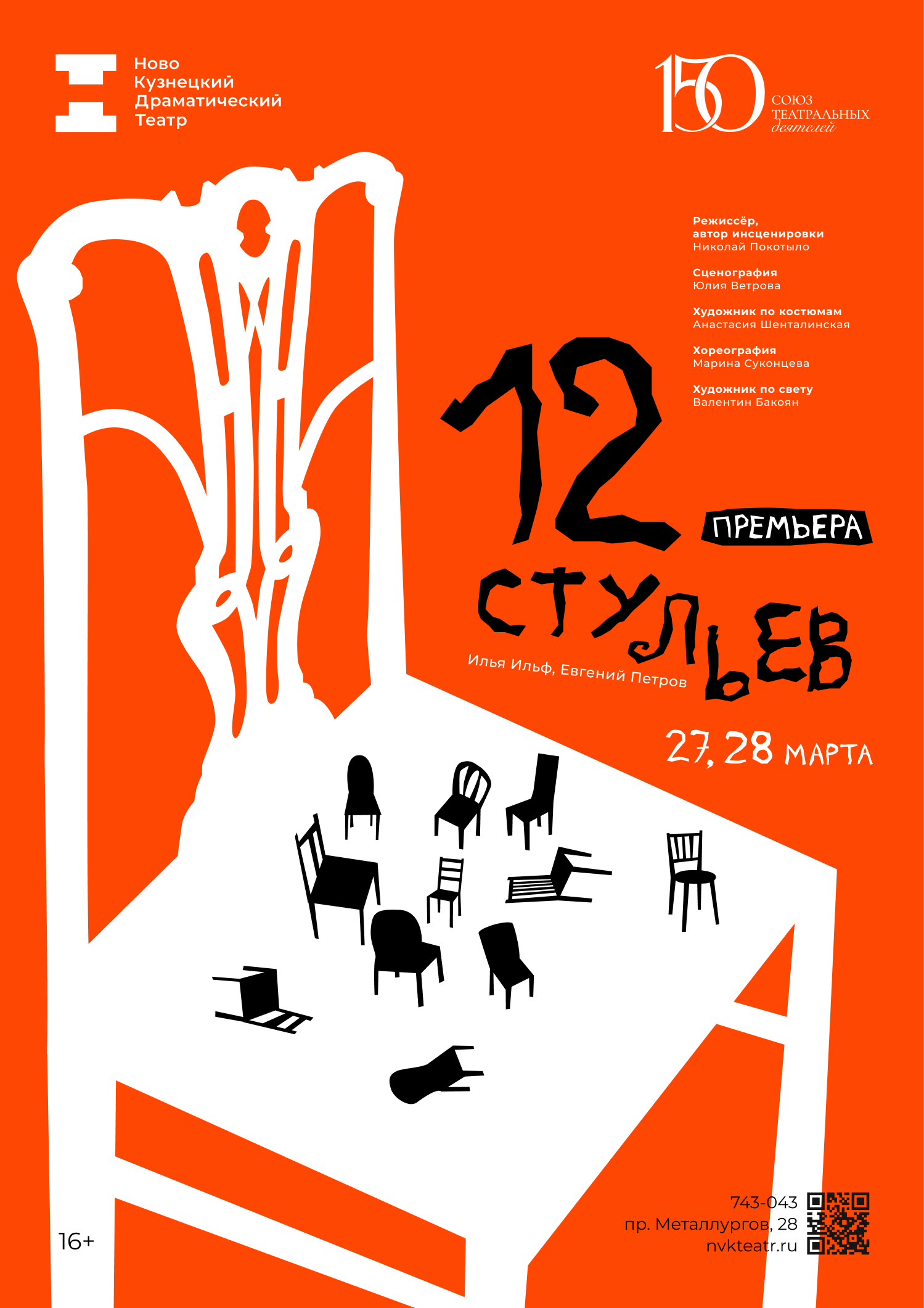 27 марта в 18:30, во Всемирный день театра, в Новокузнецком драматическом театре состоится премьера комедии «12 стульев». Показ пройдет в рамках всероссийской акции «Ночь театрального искусства» и будет приурочен к 150-летию Союза театральных деятелей Российской Федерации.